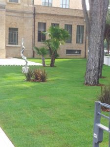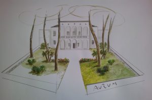 Sullo sfondo del giardino si dispiegano le raffinate forme del doppio loggiato, impreziosendo la visione scenica che accompagna il visitatore all’ingresso dell’Aurum.