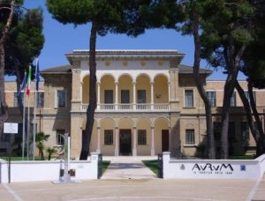 L’area ha una forma irregolare, ma simmetrica rispetto ad un asse centrale che attraversa l’intera zona verde per aprirsi in corrispondenza del loggiato d’ingresso, ampliando lo sguardo del visitatore verso la facciata del Kursaal. Da poco tempo riportato allo splendore di una volta, il giardino presenta una serie di conifere salvaguardate dall’intervento di restauro, sia per la continuità della vegetazione con l’adiacente Pineta Dannunziana sia per la continuità storica: esemplari di questa tipologia di pianta erano già presenti all’ingresso del vecchio Kursaal. Questa risistemazione, curata dalla ditta “Val Mavone” di Pescara, ha perseguito una doppia finalità: la prima di tipo agronomico, che ha puntato ad un innalzamento qualitativo delle caratteristiche chimoco-fisiche del suolo, agendo sul profilo stesso del terreno, migliorando così le condizioni in essere dell’ambiente pedologico; la seconda riguarda invece la messa a dimora di nuove essenze selezionate, autoctone e appartenenti alla flora mediterranea, collocate nel giardino in maniera simmetrica, in relazione alla forme dell’area stessa. Tutto ciò ha consentito di dar vita ad un’espressione paesaggistica suggestiva e di grande effetto, con l’introduzione di essenze in grado di esprimere una elevata capacità ornamentale in piena sintonia con l’ambiente circostante e rispettosa delle caratteristiche architettoniche dell’edificio presente. All’interno del giardino sono collocate due opere rilevanti di artisti contemporanei: la prima, firmata da Marco Mazzei, intitolata Autoritratto, donata dall’artista al Comune di Pescara, è stata realizzata nel 2011 ed è costituita da un elemento in alluminio, che si innalza nello spazio con movimenti tortili e sinuosi generando curve e variazioni direzionali e piegandosi da un lato come per scansare qualcosa che gli arriva incontro: un’opera di grande impatto che spicca per la luminosità del materiale e per i giochi di luce creati grazie all’uso della tecnica dello sbalzo; la seconda opera è dell’artista Antonio Nocera, chiamata “Pinocchio luna”. È realizzata in bronzo e rappresenta una falce di luna sulla quale si dispiega un vero e proprio paesaggio fiabesco dove il protagonista è appunto Pinocchio . E’ una scultura che fa parte di un progetto molto più articolato, composto di un ciclo di opere con soggetto la favola di Collodi. Il lavoro di Nocera si ispira al mondo delle fiabe che riesce a penetrare nell’animo dello spettatore, accompagnandolo in un viaggio fantastico, indietro nel tempo, evocando emozioni e sensazioni dell’infanzia. L’obiettivo dell’artista è di coinvolgere adulti e bambini, sedotti dalla rappresentazione di un personaggio amato come Pinocchio.