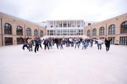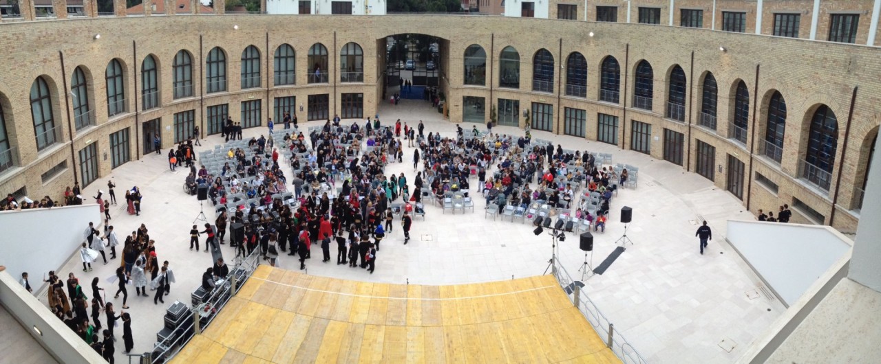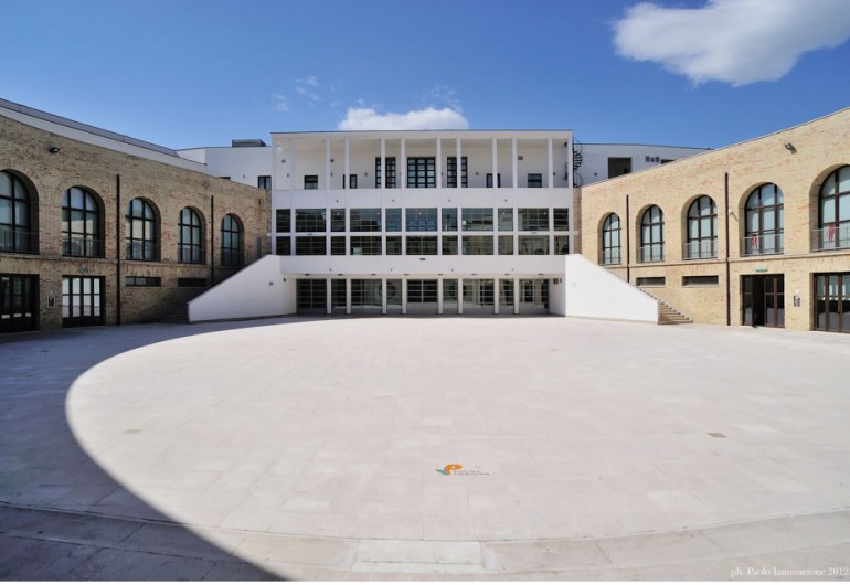 Il piazzale è di forma circolare, con le corti laterali che sembrano avvolgere il visitatore e che si sviluppano su due livelli: il primo è occupato dai locali oggi riservati all’Archivio di Stato di Pescara e vede grandi aperture quadrangolari che contrastano con le grandi finestre arcuate del secondo piano. La spettacolarità della piazza aumenta nel momento in cui si volge lo sguardo verso l’alto: nella sua progettazione infatti l’architetto Michelucci, autore dell’ampliamento della fabbrica voluto dalla famiglia Pomilio, è riuscito a non sbarrare la visuale verso l’alto nonostante l’aggiunta di un terzo piano grazie alla presenza di una terrazza continua che circonda l’ultimo piano e che amplia lo sguardo verso il cielo.