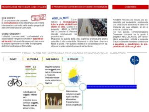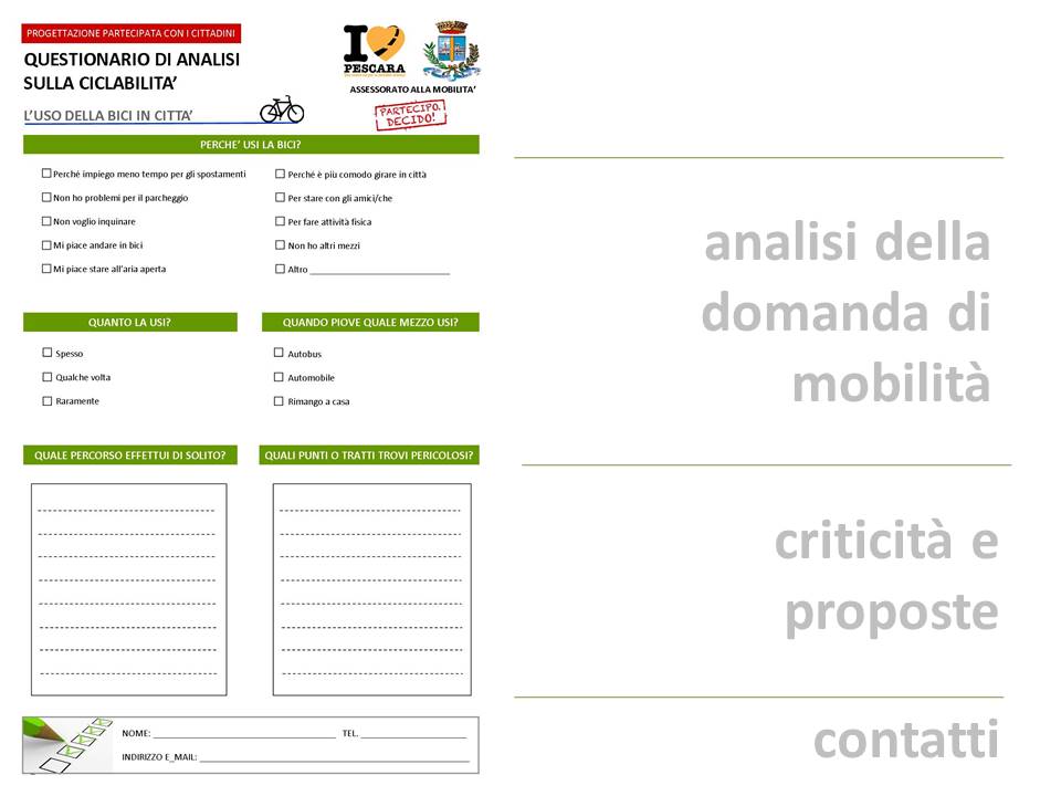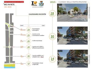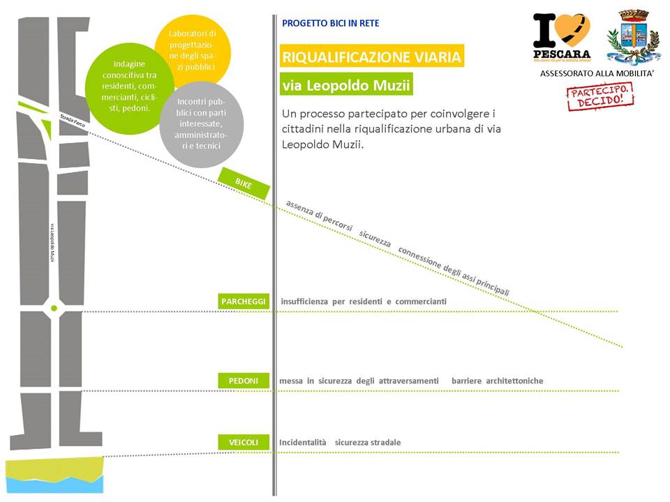 Di seguito i documenti di elaborazione e del processo di lavoro. In particolare la mappa concettuale, la descrizione dell’articolazione del percorso, il questionario e il cronoprogramma degli eventi. Il questionario sarà utile ai tecnici della mobilità e progettisti della pista ciclabile per capire le abitudini dei ciclisti pescaresi. Il modulo è dedicato a coloro che percorrono la zona nord della città e che transitano nei pressi di via Leopoldo Muzii.