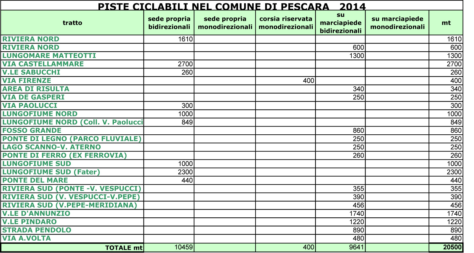 Tabella piste ciclabili 2014