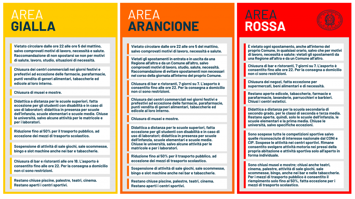 Di seguito le tre aree di criticità del Paese e le principali misure restrittive previste dal nuovo DPCM.